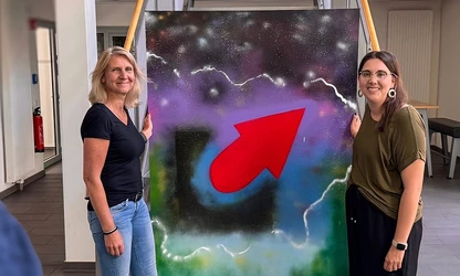 Fotohinweis: Claudia Keßler (l.) und Eileen Just von der Initiative Kurve kriegen präsentieren das Kunstwerk, Workshop-Leiter Manuel Meller (l.) steht zusammen mit dem jungen Künstler im Vordergrund. Foto: Polizei Bochum