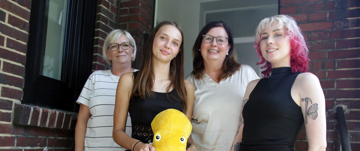 (v.l.) Wilma Leitow, Jessica Gebauer, Gruppenleitung Heike Weide und Charlotte Kost aus dem Team der Tagesgruppe Ost am Eingang des ehemaligen Pfarrhauses